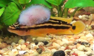 توده های پنبه مانند و کثیف بر روی پوست که ممکن است نواحی گسترده ای از پوست را آلوده کند. سفید شدن تخم های ماهی ها