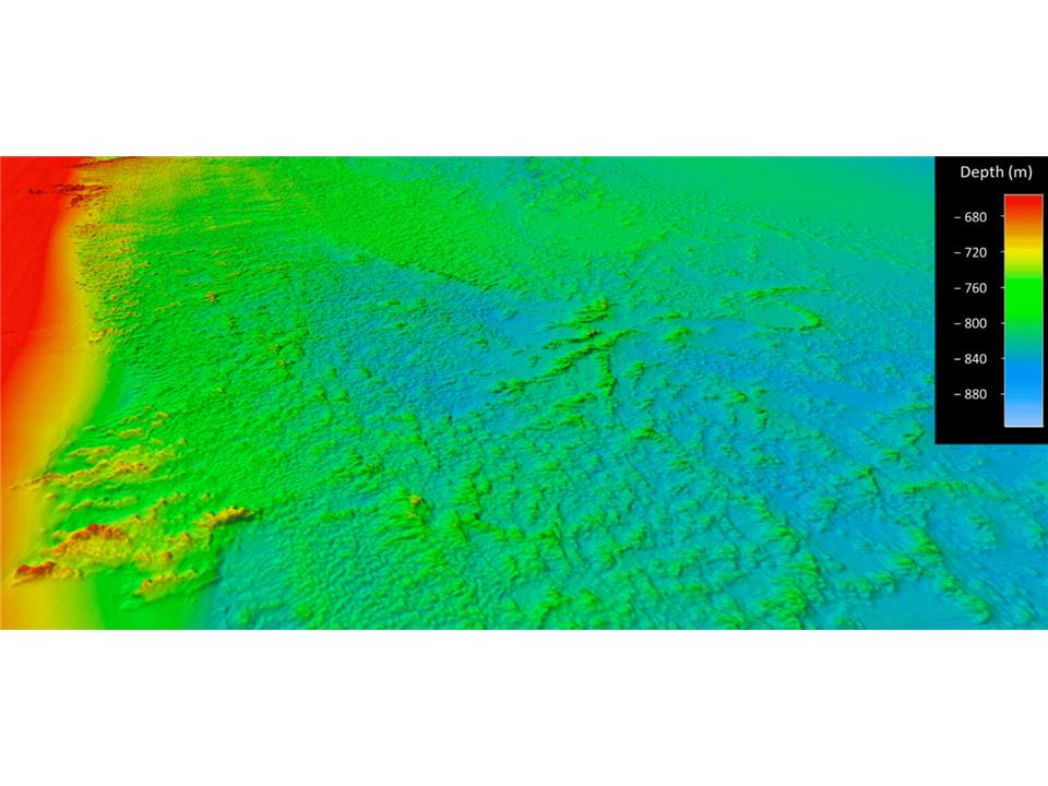 نمونه ای از داده های عمق سنجی چند پرتوی کف دریا که ویژگی های تپه مرجانی واقع در فلات بلیک را نشان می دهد.