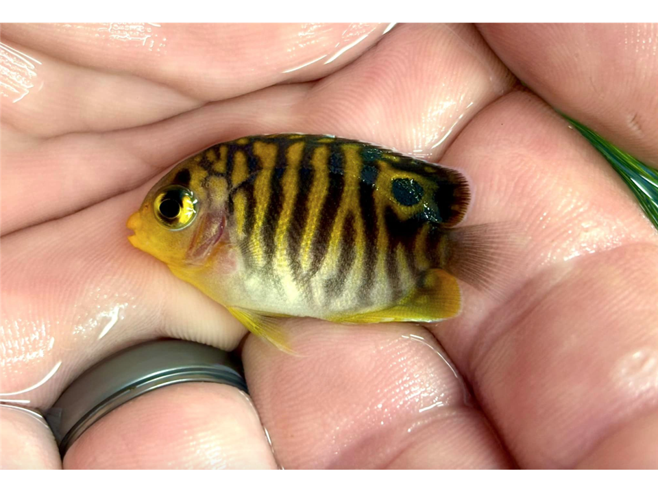 Apolemichthys xanthotis متعلق به آزمایشگاه Poma Labs که در اسارت پرورش یافته است.