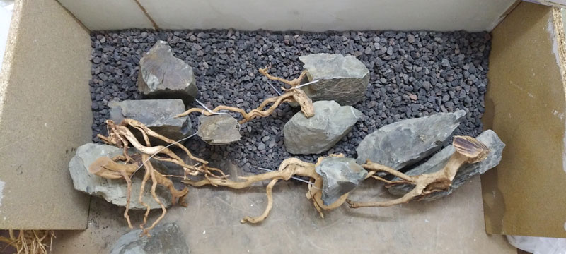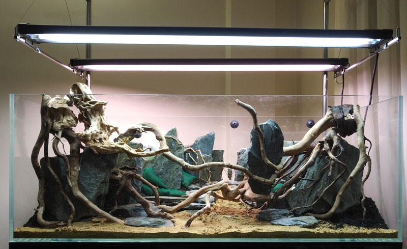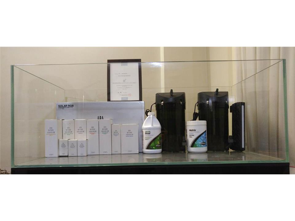 بستر تانک: پوکه معدنی برای ارتفاع، باکتر ۱۰۰ و کلیر سوپر برای زیر سازی، ۲ بسته آمازونیا ADA و یک بسته شن تزیینی کلورادو ADA